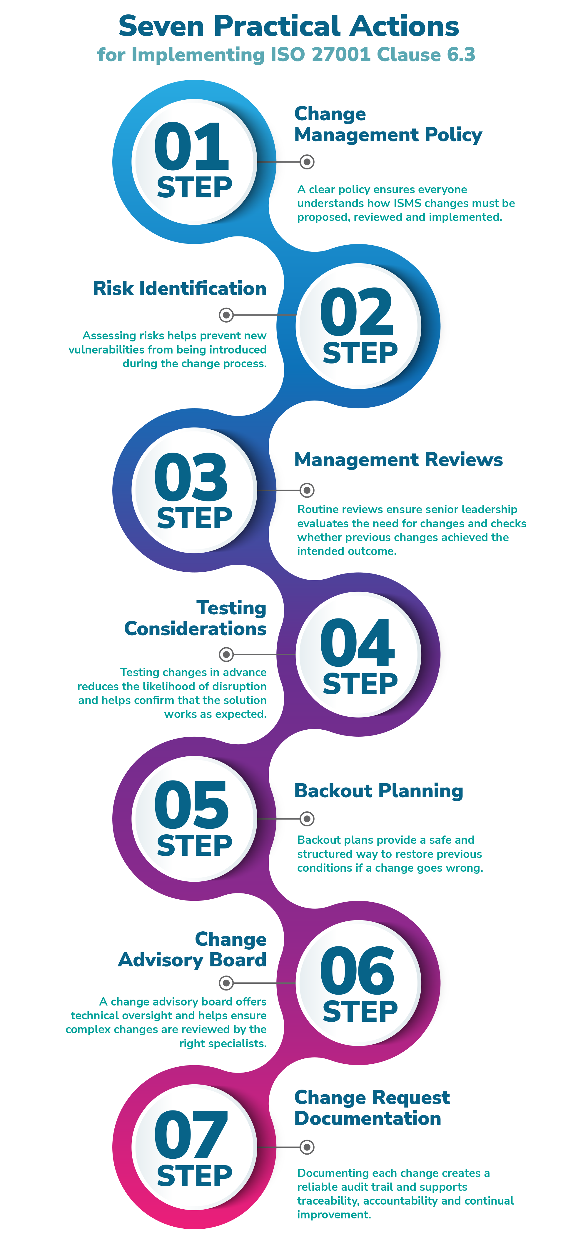 Whilst Clause 6.3 does not state specifically how organisations should manage changes to the ISMS in practice, we recommend taking the following actions.