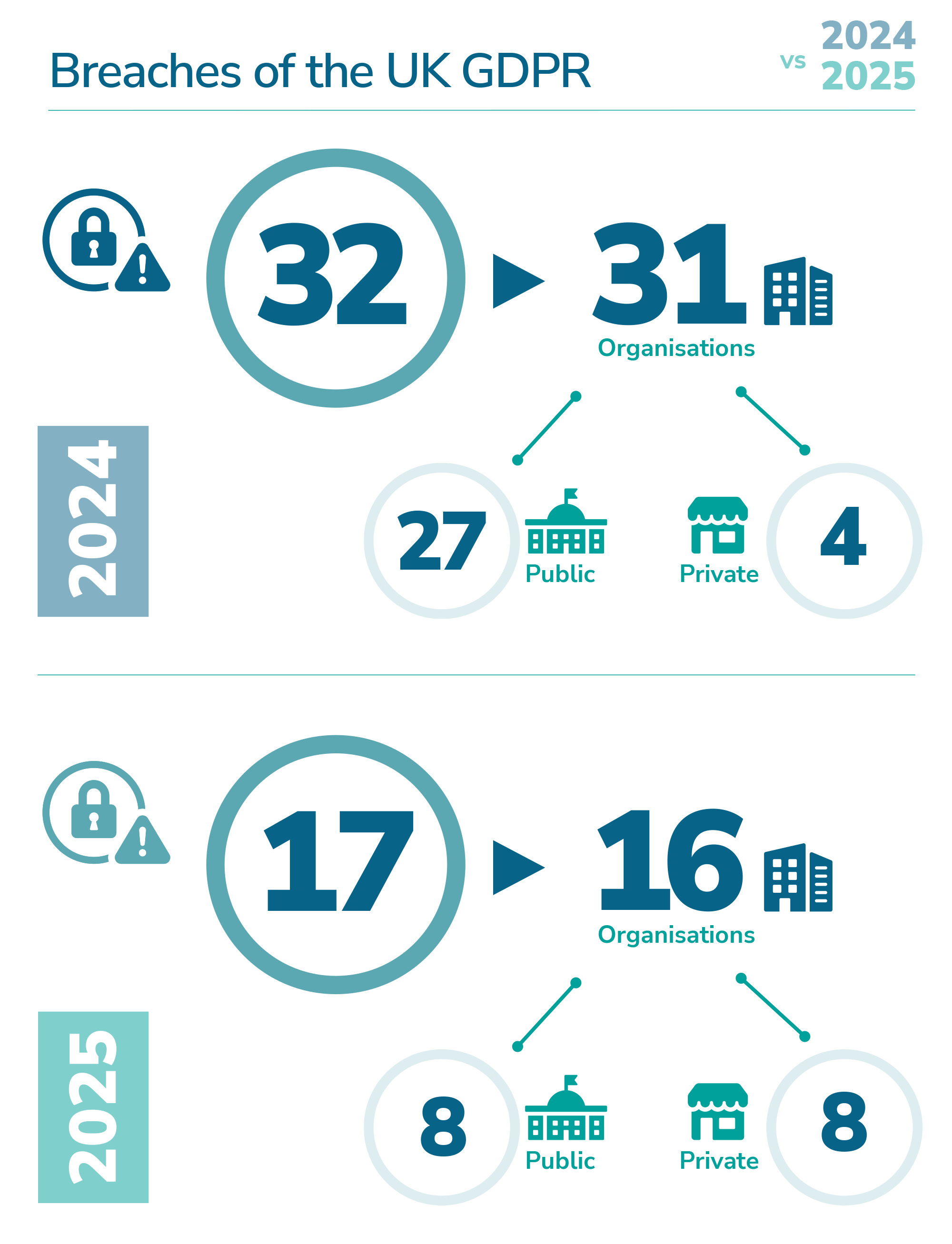 The number of GDPR/DPA-related enforcement actions last year was down by nearly a half on 2024, with a much higher proportion of private sector businesses represented. So, in addition to the major decline in enforcement activity year on year, another startling turnaround from 2024 was in the composition of the entities enforced against under UK GDPR/DPA: in the previous year, private sector organisations comprised only around one eighth of the total, whereas in 2025 the proportion soared to nearly one half.
