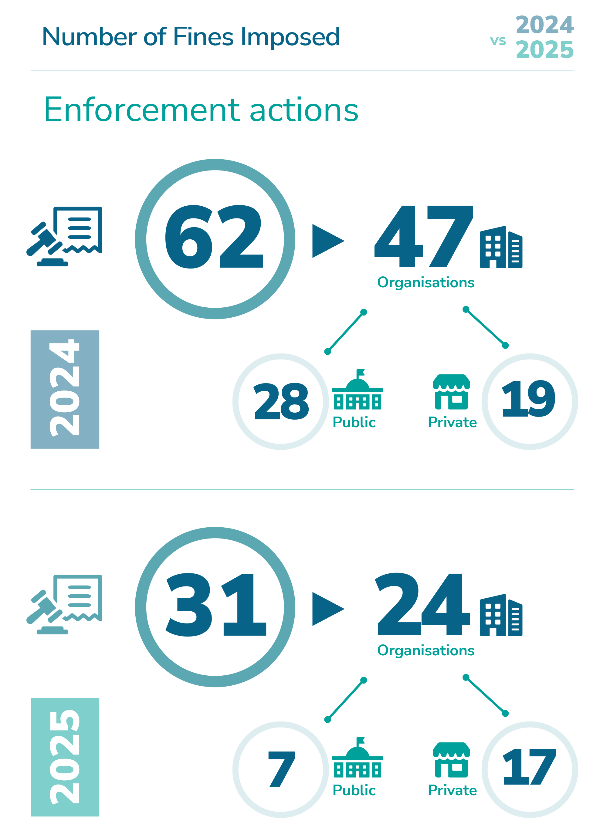 However, as demonstrated by the above graphic, there were only 31 occasions on which the ICO took enforcement action in 2025, half of the frequency compared to the previous year. Of the 7 public sector organisations enforced against, 3 were police forces - with one force, Greater Manchester Police, receiving two reprimands in the space of 6 months. So, the Police were again overrepresented in the figures, although to a lesser extent than in 2024.