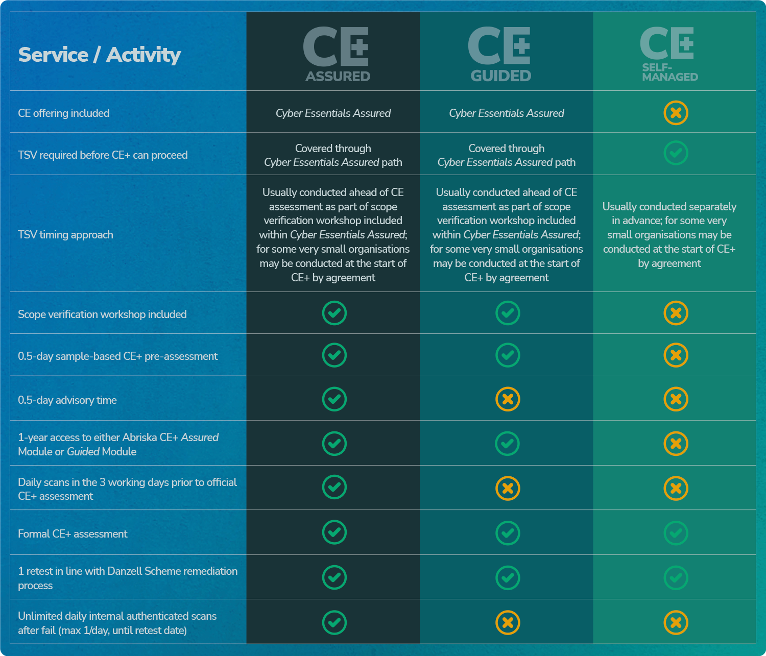 Cyber Essentials PLUS Self Managed is an assessment only service. It includes Technical Scope Verification, the CE+ assessment, and one retest in line with Danzell remediation rules. No preparation activity, advisory support, or access to the Abriska CE+ module is included.